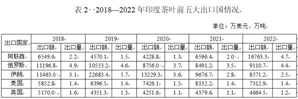 印度主要茶叶出口品种以CTC茶(经压碎、撕裂、揉卷工艺制成的红碎茶)为主,该品类占到印度茶叶出口总量的80%以上。2022年,排名前五的出口市场依次为阿联酋、俄罗斯、伊朗、美国和英国,出口量分别为4.7万吨、4.4万吨、2.5万吨、1.4万吨和1.2万吨(见表2),合计占出口总量的58.9%,出口额分别为1.7亿美元、9111万美元、8571万美元、7313万美元和4665万美元,合计占出口总额的56.2%。值得关注的是,阿联酋对印度茶叶的进口需求持续增长,主要用于转口贸易及国内消费。2022年,阿联酋首次超过俄罗斯和伊朗,一跃成为印度第一大茶叶进口国。
