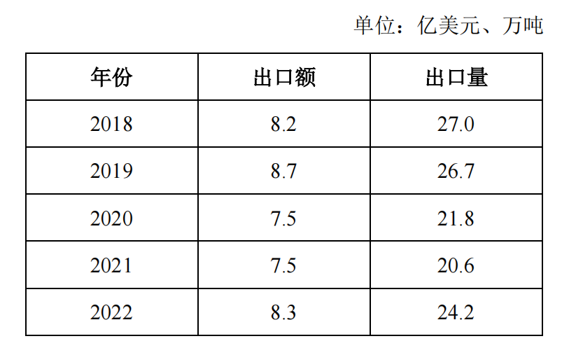 近年来,尽管受新冠肺炎疫情影响,印度茶叶出口出现波动,但年出口量仍维持在20万吨以上水平,年均出口额超过7.5亿美元。2019年茶叶出口量达到峰值26.7万吨(见表1),在疫情期间,受国际市场需求萎缩、国际物流运输受阻等因素影响,2020年茶叶出口下降16.8%,2021年进一步降至20.6万吨。2022年,随着各国市场逐步开放,以及经济危机对主要出口国斯里兰卡的冲击,印度茶叶迎来新的增长,出口量恢复至24.2万吨,出口额达到8.3亿美元。