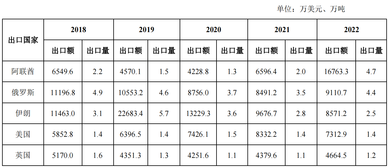 印度主要茶叶出口品种以CTC茶(经压碎、撕裂、揉卷工艺制成的红碎茶)为主,该品类占到印度茶叶出口总量的80%以上。2022年,排名前五的出口市场依次为阿联酋、俄罗斯、伊朗、美国和英国,出口量分别为4.7万吨、4.4万吨、2.5万吨、1.4万吨和1.2万吨(见表2),合计占出口总量的58.9%,出口额分别为1.7亿美元、9111万美元、8571万美元、7313万美元和4665万美元,合计占出口总额的56.2%。值得关注的是,阿联酋对印度茶叶的进口需求持续增长,主要用于转口贸易及国内消费。2022年,阿联酋首次超过俄罗斯和伊朗,一跃成为印度第一大茶叶进口国。