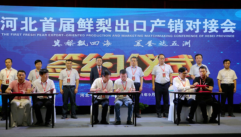 对接会上,由20多家鲜梨出口企业成立的河北鲜梨出口企业联盟揭牌,中外水果进出口企业进行了产品推介。河北长城公司、天洋公司和东方果品公司等与采购商签约,销售鲜梨2万吨,签约金额达1亿元。