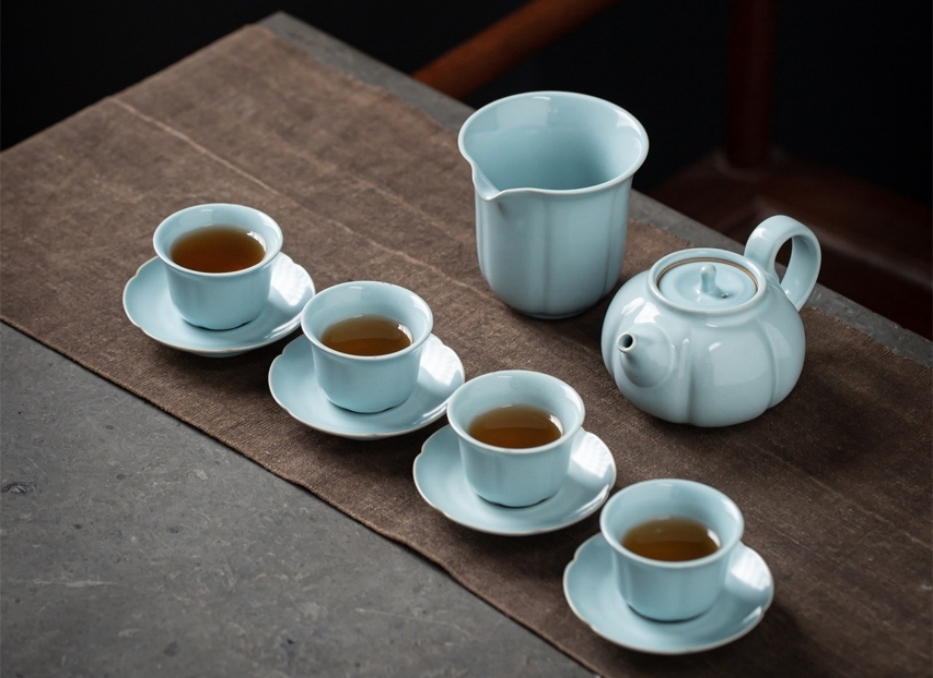 汝瓷茶具有天青、天蓝、豆绿、月白等釉色,造型“简而精,朴而实”,开片“丝如豪,质如金”,质感“润如肤,堆如脂”。在鉴赏汝瓷茶具时应将其内外洗净,避免有油污接触汝瓷;使用时,可用养壶笔沾茶汁滋润汝瓷表面,此后可欣赏汝瓷表面蝉翼纹之变化;使用汝窑器后,可将茶渣清除干净,用清水冲洗晾干;汝瓷在未使用时,可静置于干燥、清洁雅室之内。