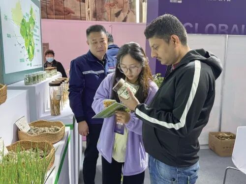 尼泊尔客商在安丘市供销农业生产资料有限责任公司展台了解三七产品。
