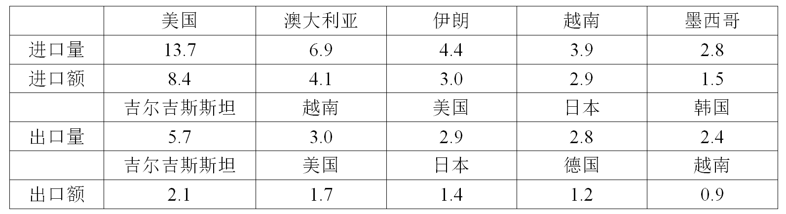 从贸易伙伴看,2019年我国坚果主要进口来源地包括美国、澳大利亚、伊朗、越南和墨西哥,出口主要市场包括吉尔吉斯斯坦、美国、日本和越南(表1)。
