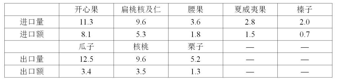 表2 2019年我国坚果进出口主要品种(单位:万吨、亿美元)
