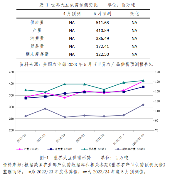 据美国农业部2023年5月期《世界农产品供需预测报告》,世界大豆供需形势变动情况简述如下:
