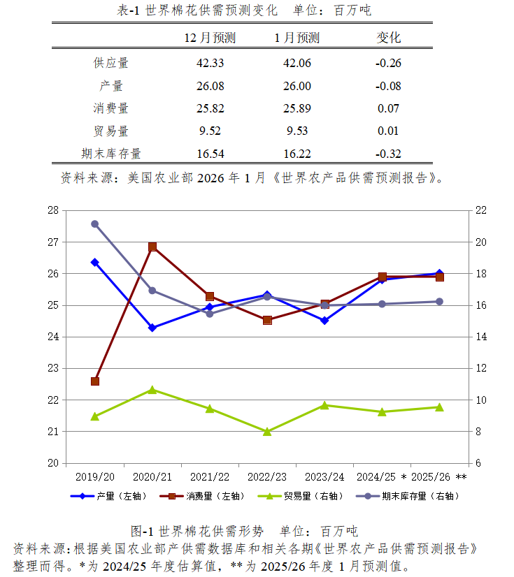 2025/26年度世界棉花供应量预计为4206万吨,较2024/25年度估算值增加30万吨,比12月预测值下调26万吨。