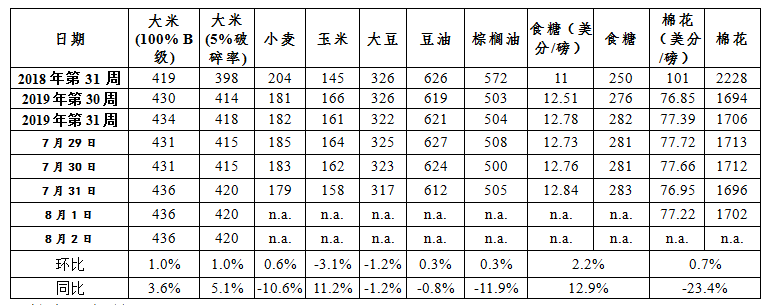 主要农产品国际价格一周日价均价及其变动情况(2019年第31周)