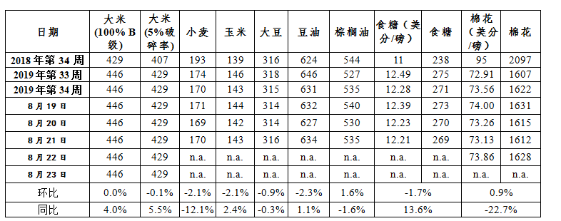 2.大米(100%,B级)、大米(5%破碎率),为泰国曼谷离岸价,为该周泰国政府公布价格,采自泰国大米出口商协会网站,联合国粮农组织和商品价格数据库数据作为参照。