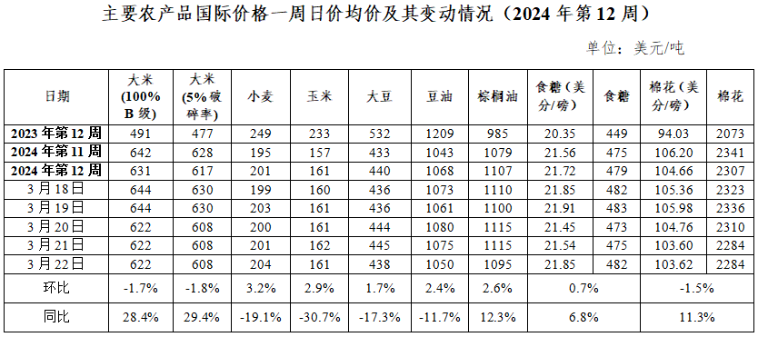 2.大米(100%,B级)、大米(5%破碎率),为泰国曼谷离岸价,为该周泰国政府公布价格,采自泰国大米出口商协会网站,联合国粮农组织和商品价格数据库数据作为参照。
