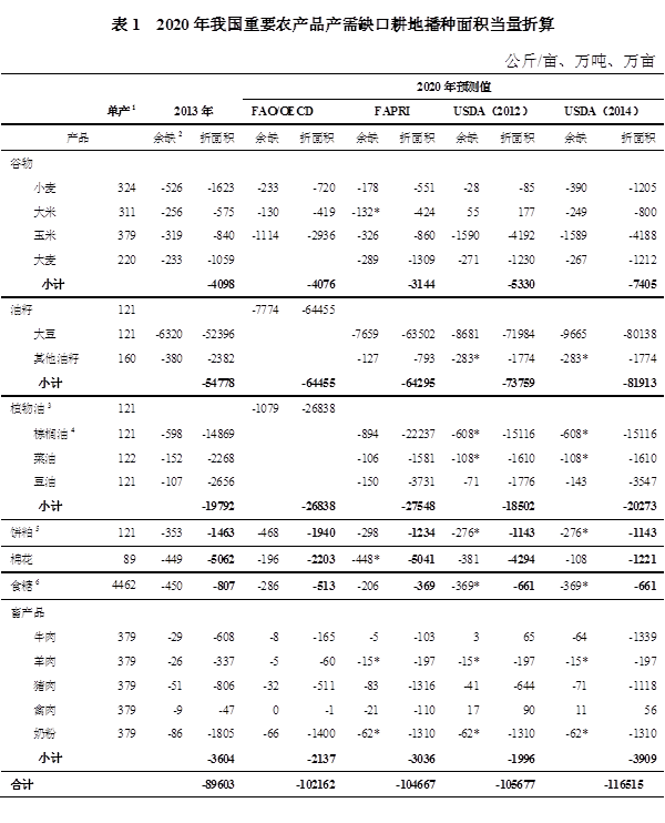 2014年USDA预测,到2020年我国大米、小麦、玉米、大麦缺口分别为249.2万吨、390.2万吨、1588.6万吨和267.3万吨;大豆和豆油缺口分别为9664.7万吨和142.6万吨;棉花缺口108.4万吨;猪肉和牛肉缺口分别为70.7万吨和63.5万吨。其他未预测产品缺口按2010-2013年的净进口水平计算,其预测的2020年我国重要农产品缺口相当于11.7亿亩左右耕地播种面积的产出(表1)。