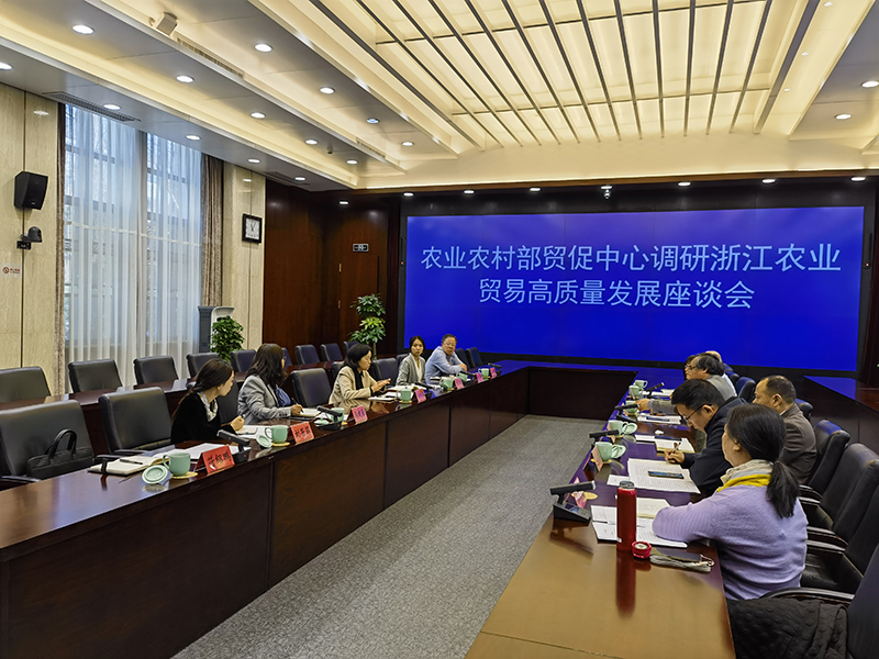 在杭州市,调研组与浙江省农业农村厅相关部门单位进行了座谈,走访了省粮油食品进出口公司和杭州卢正浩茶叶有限公司,全面了解浙江省农业贸易发展情况、推进农业贸易高质量发展的举措、存在的困难及诉求等。马洪涛表示,浙江具有发展农产品贸易的良好基础,推进农业贸易高质量发展,一是要夯实基础,保住目前农产品进出口的基本盘;二是要做出亮点,充分挖掘农产品和预制菜贸易的巨大潜力,推动浙品浙菜出海;三是要整合各方资源,共促农业贸易发展;四是要创新贸易方式,尝试将义乌贸易模式与业态应用到优势特色农产品出口中。贸促中心将持续深化与浙江多层次、全方位合作,在贸易信息共享、贸易壁垒应对方面加强对浙江支持,助力浙江在推进农业贸易高质量发展中发挥示范引领作用。