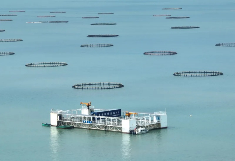 图片半潜桁架式渔业智能养殖平台海威1号及其附属网箱集群。